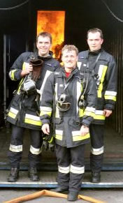und zeigt die Ausbilder nach dem Flashovertraining vor dem Brandcontainer.